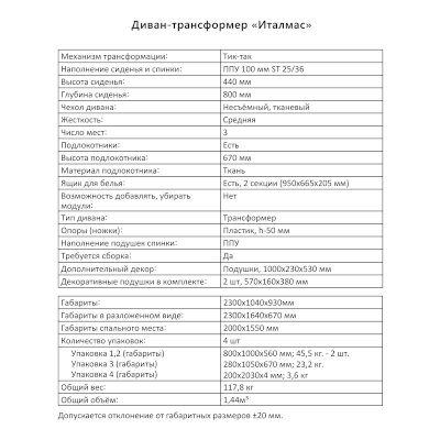 Диван-трансформер Италмас (Аквилон) продается в интернет-магазине mebel-online-nefteyugansk.ru по цене 73 376 руб. Есть доставка по Нефтеюганску и Ханты-Мансийскому автономному округу. Возможность подъема на этаж и сборки уточняйте у менеджера по телефону 8(800)505-27-11.